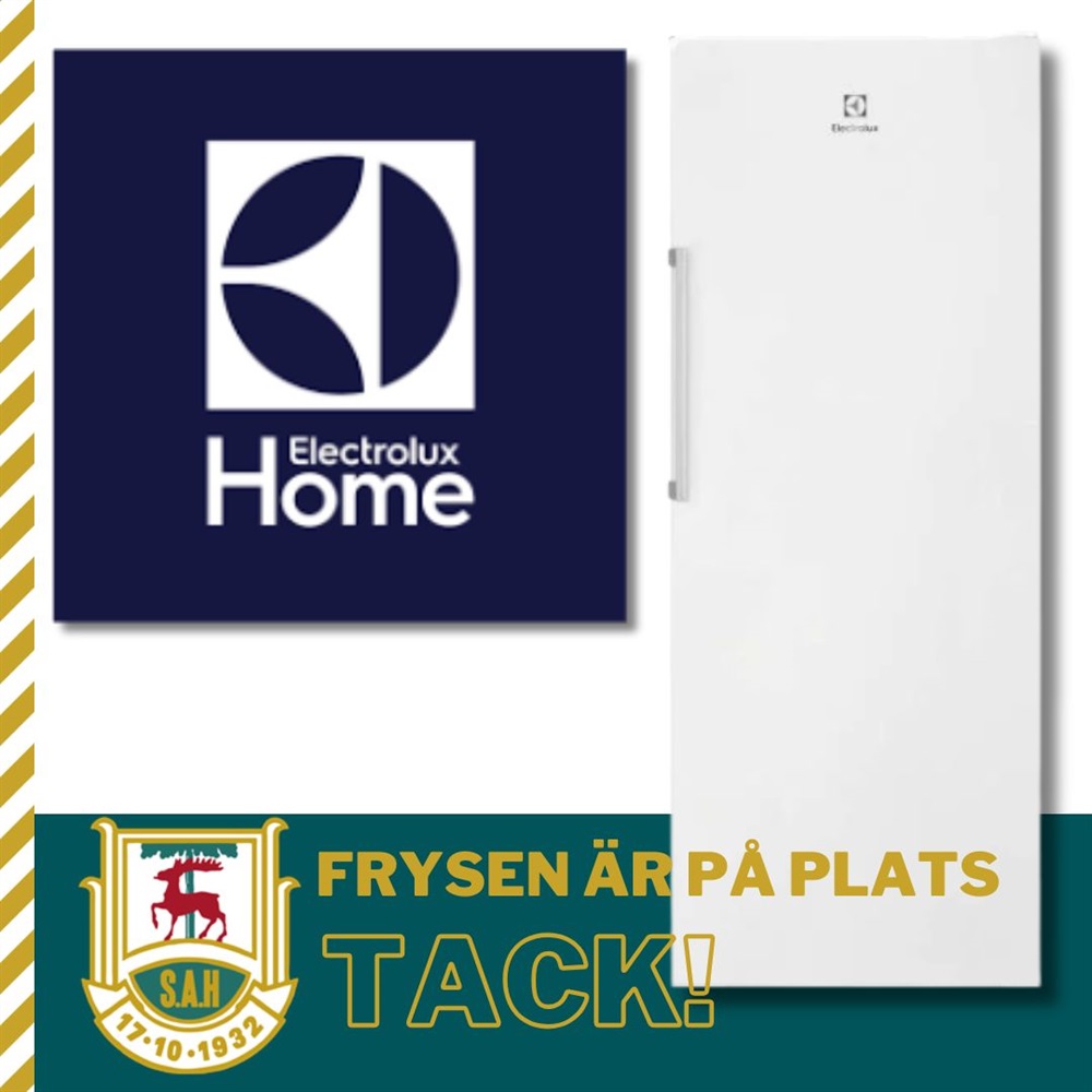 Vi vill tacka Electrolux home för deras givmildhet när de skänkte en frys som vi behövde till vårt kafé i ishallen. Nu är den på plats, inkopplad och full med hamburgebröd.