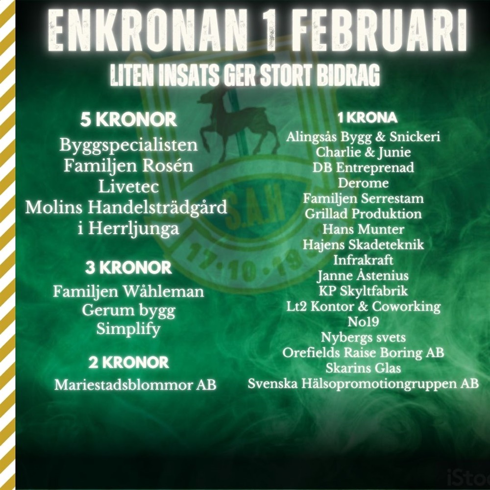Enkronan är en sponsoraktivitet för alla företag och privatpersoner. En stor fördel med Enkronan är att det är en relativt liten insats för sponsorn, men ger ett väldigt stort bidrag till föreningen.