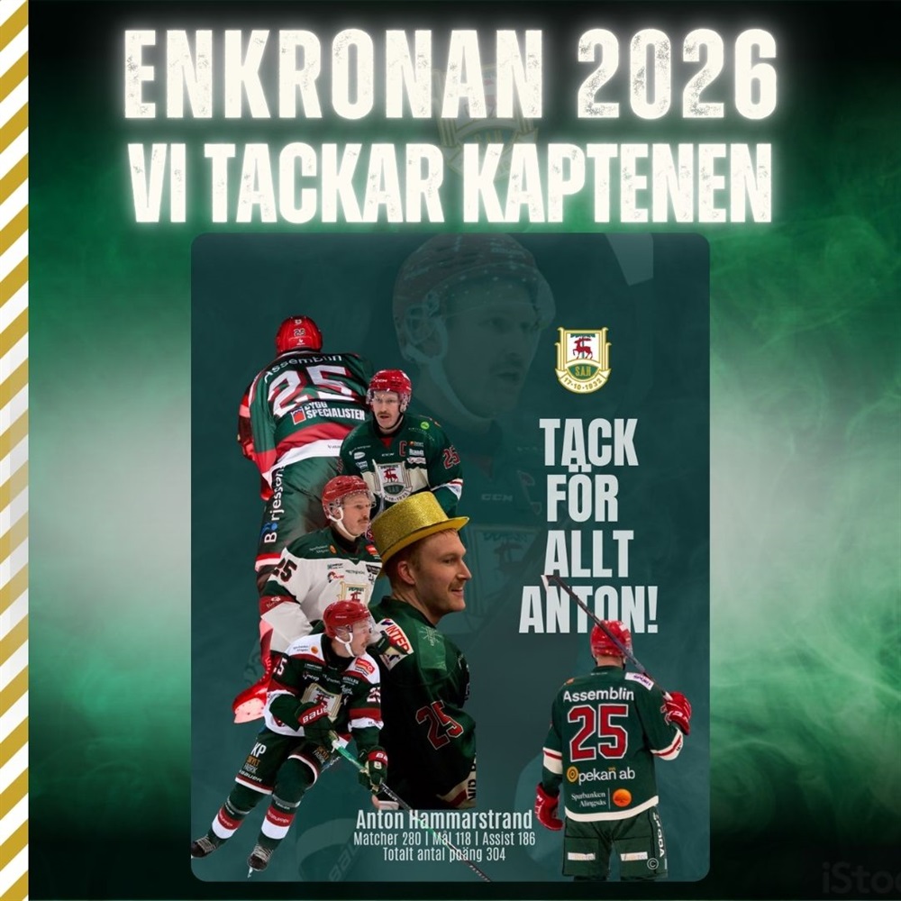 Innan Enkronasmatchen på söndag så kommer kapten Anton Hammarstrand att tackas och hyllas för den insats han gjort för föreningen både som spelare och människa. Han var tvungen att avsluta sin spelarkarriär i höstas efter många år som trogen kapten i SAH. Det kommer ske på isen strax inan matchstart så kom i god tid och visa er uppskattning för en av våra stora föreningshjältar.