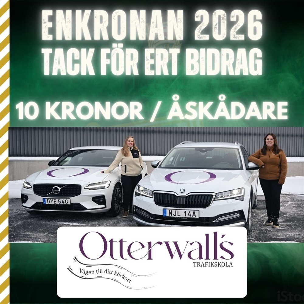 Otterwall's Trafikskola AB går in med 10 kr till Enkronasmatchen som föreningen har söndag den 1 februari. Tack vare stödet kan vi fortsätta utveckla vår verksamhet och på det sättet fortsätta skapa meningsfull sysselsättning åt våra barn och ungdomar.