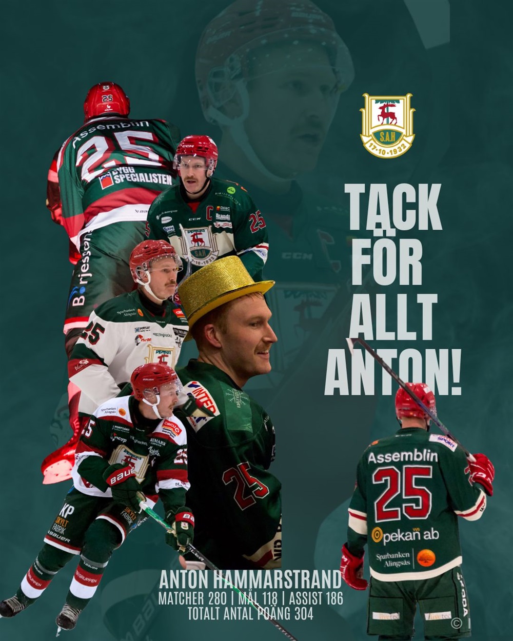 Det är inte bara ledsamt för att han är en otroligt duktig hockeyspelare utan också för att han är en fantastisk människa som alltid bryr sig om sin omgivning och sina medmänniskor. Han har under 13 säsonger spelat i vårt A-lag varav de senaste sju som kapten. En drivande kapten som lyfter omgivningen och som sköt upp laget i Hockeytvåan igen efter sju år i Hockeytrean. Anton har slitit hårt för att föreningen ska vara där vi är idag.